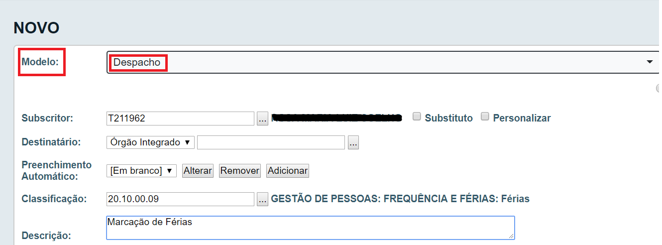 A ação Incluir Documento permite criar e juntar qualquer outro tipo documental ao documento em andamento, tais como despacho, memorando e parecer.Ao selecionar a opção INCLUIR DOCUMENTO, o sistema carregará a tela de criação de um novo documento com o campo MODELO já preenchido com DESPACHO, por ser este o tipo documental mais utilizado para dar andamento aos expedientes e processos. Entretanto, o usuário pode selecionar qualquer outro documento da listagem.